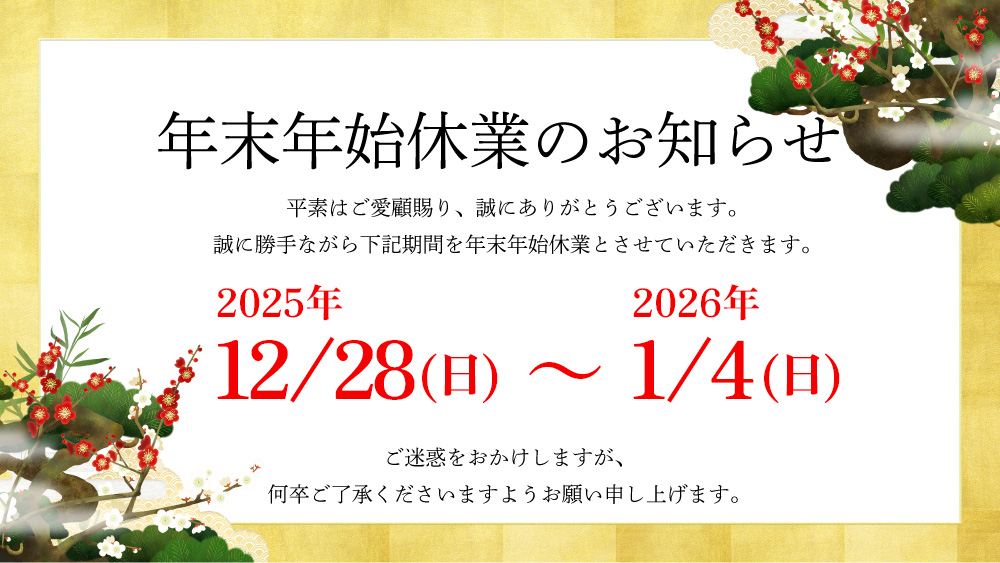 年末年始休暇:2025年12月28日(日)~2026年1月4日(日)